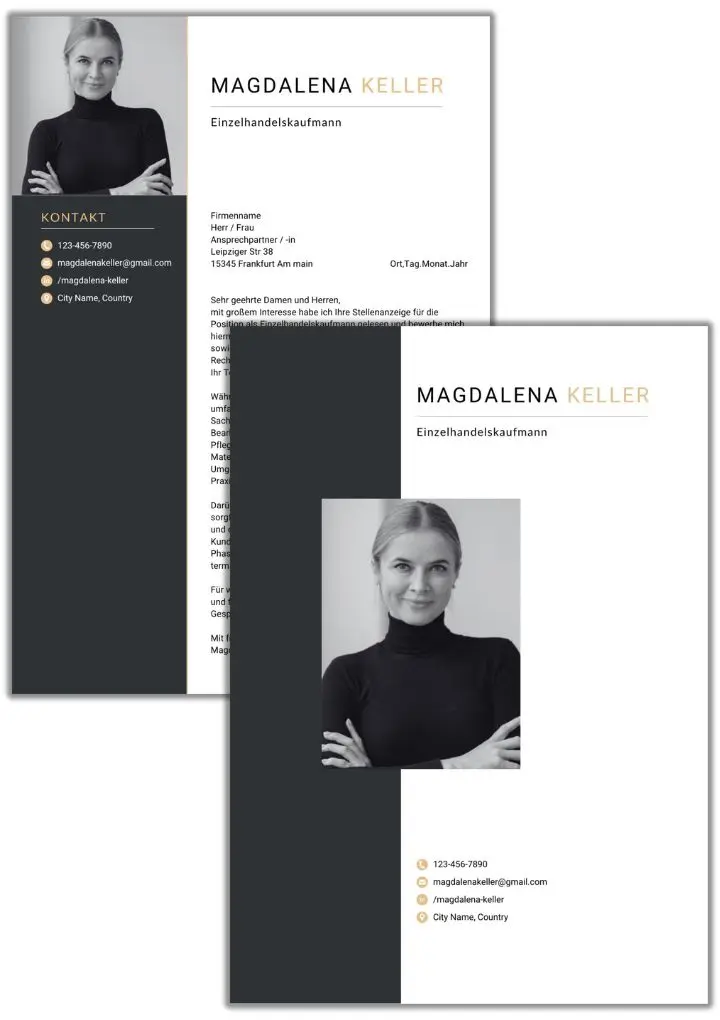 Die Vorlage wird als Microsoft Word (.docx), Google Docs, und als Canva-Link geliefert. Beide Versionen lassen sich als PDF exportieren – das Layout bleibt stabil, egal auf welchem Gerät der Arbeitgeber die Datei öffnet.