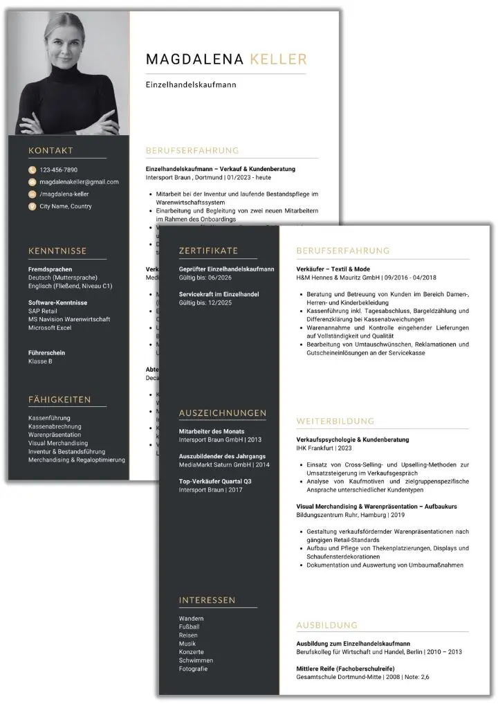 Übersichtlichkeit, Relevanz und ein professionelles Design. Personaler im Einzelhandel sehen täglich viele Bewerbungen. Was zählt: Ein strukturiertes Layout, das sofort zeigt, wo der Bewerber gearbeitet hat, welche Fähigkeiten er mitbringt und ob er zum Team passt.