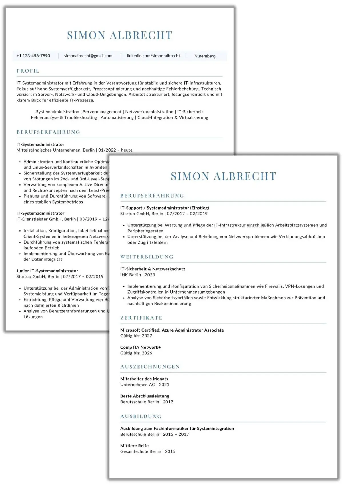Klassisch tabellarisch, chronologisch, mit klaren Abschnitten für Berufserfahrung, Ausbildung, Kenntnisse und Zertifizierungen. Zwei Seiten sind für erfahrene Sysadmins völlig in Ordnung. Die technischen Skills brauchen eine eigene, sofort sichtbare Sektion — nicht versteckt am Ende.