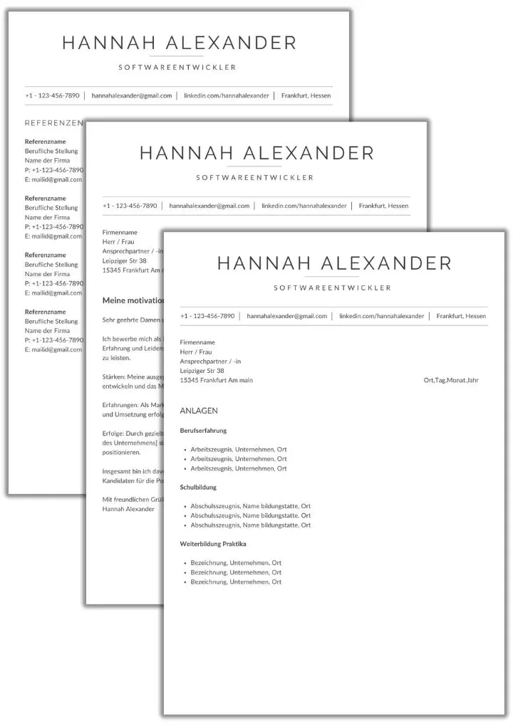 Das komplette Bewerbungsset enthält zusätzlich ein Anschreiben Softwareentwickler, ein Deckblatt und eine Referenzen-Seite. Alle Dateien sind als Microsoft Word (.docx), Canva, Google Docs und Pages editierbar und lassen sich direkt als PDF exportieren.
