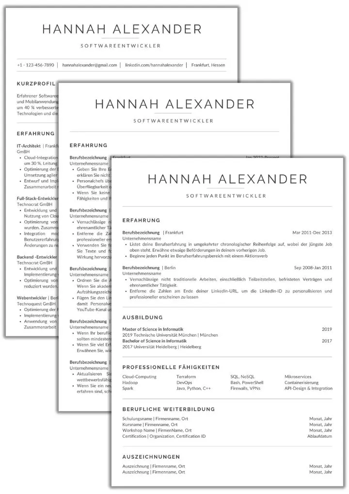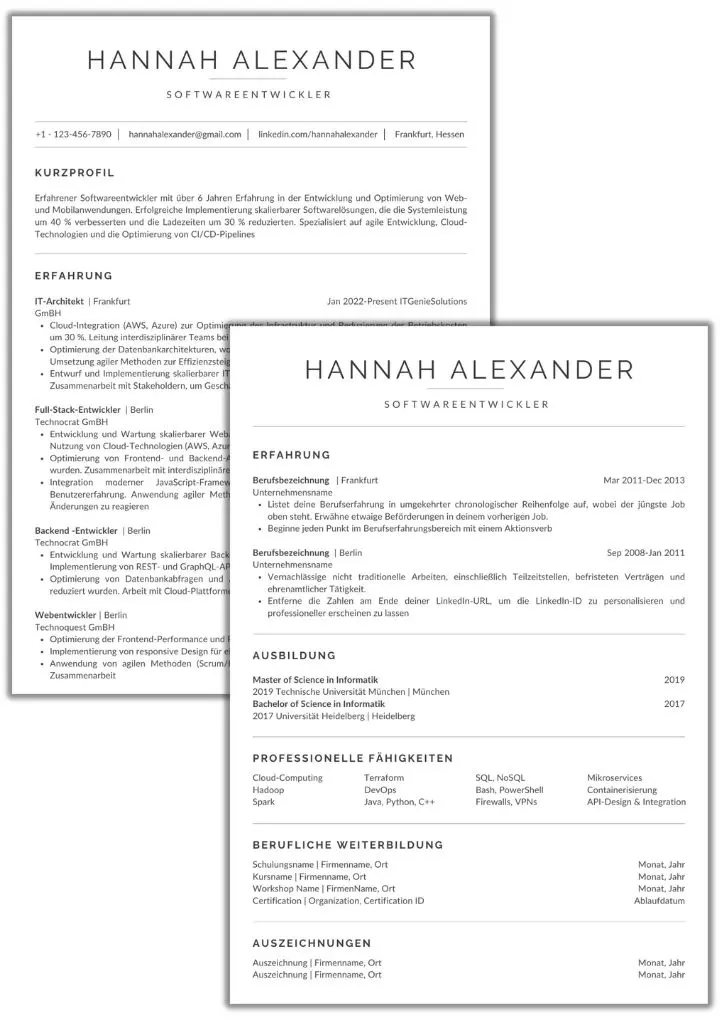 Geeignet für Bewerbungen bei Softwareunternehmen, Startups, Tech-Abteilungen großer Konzerne und internationalen IT-Teams.